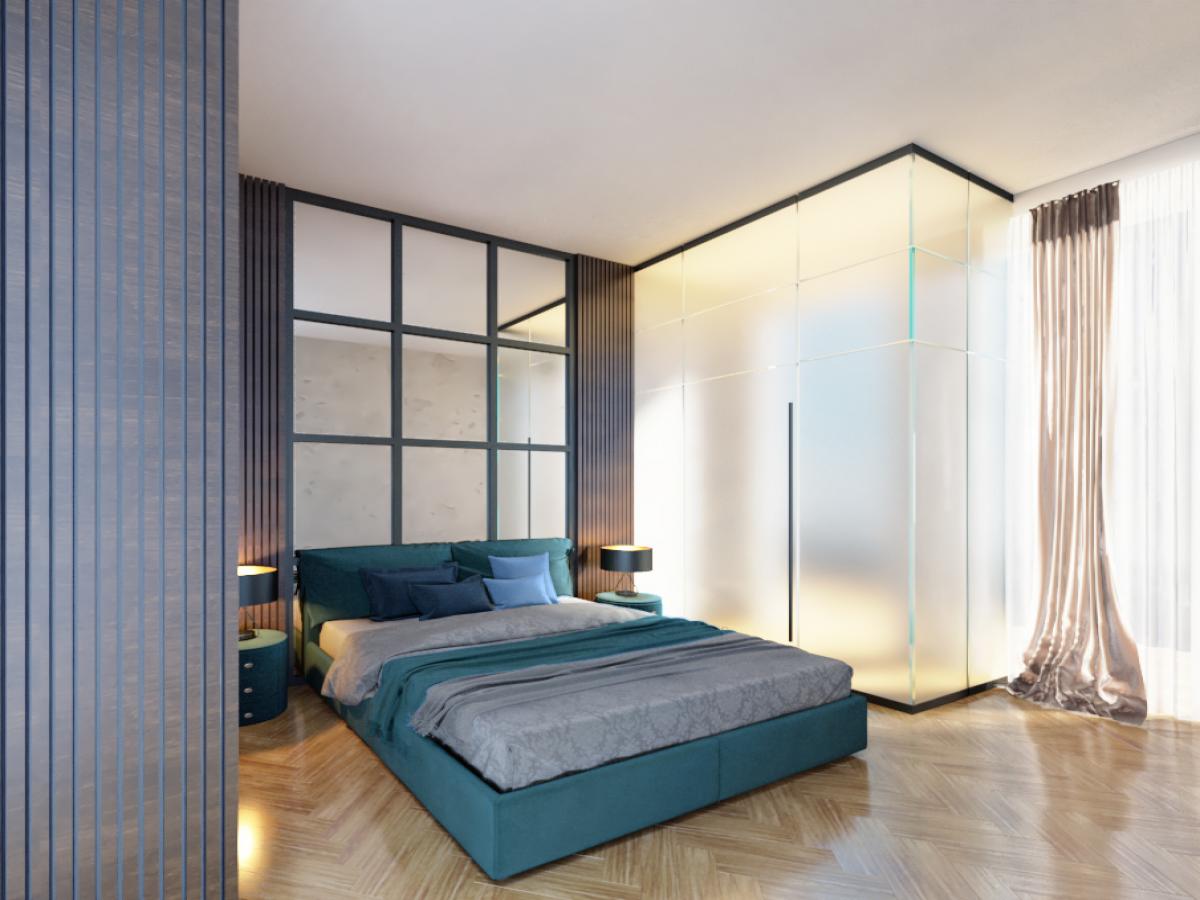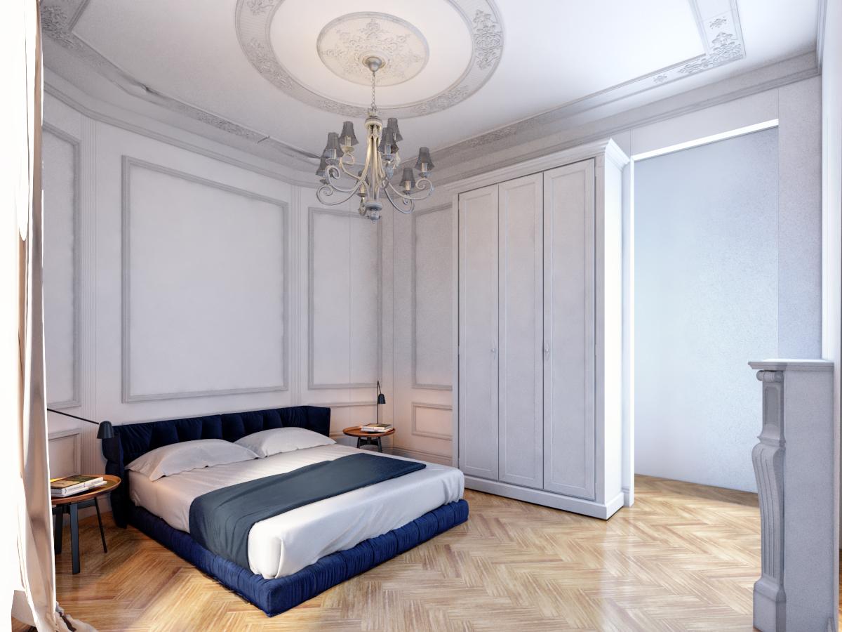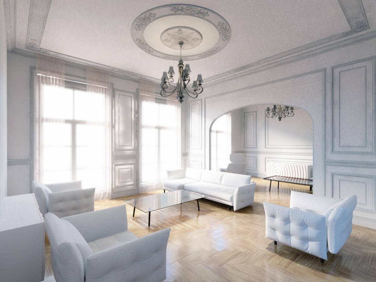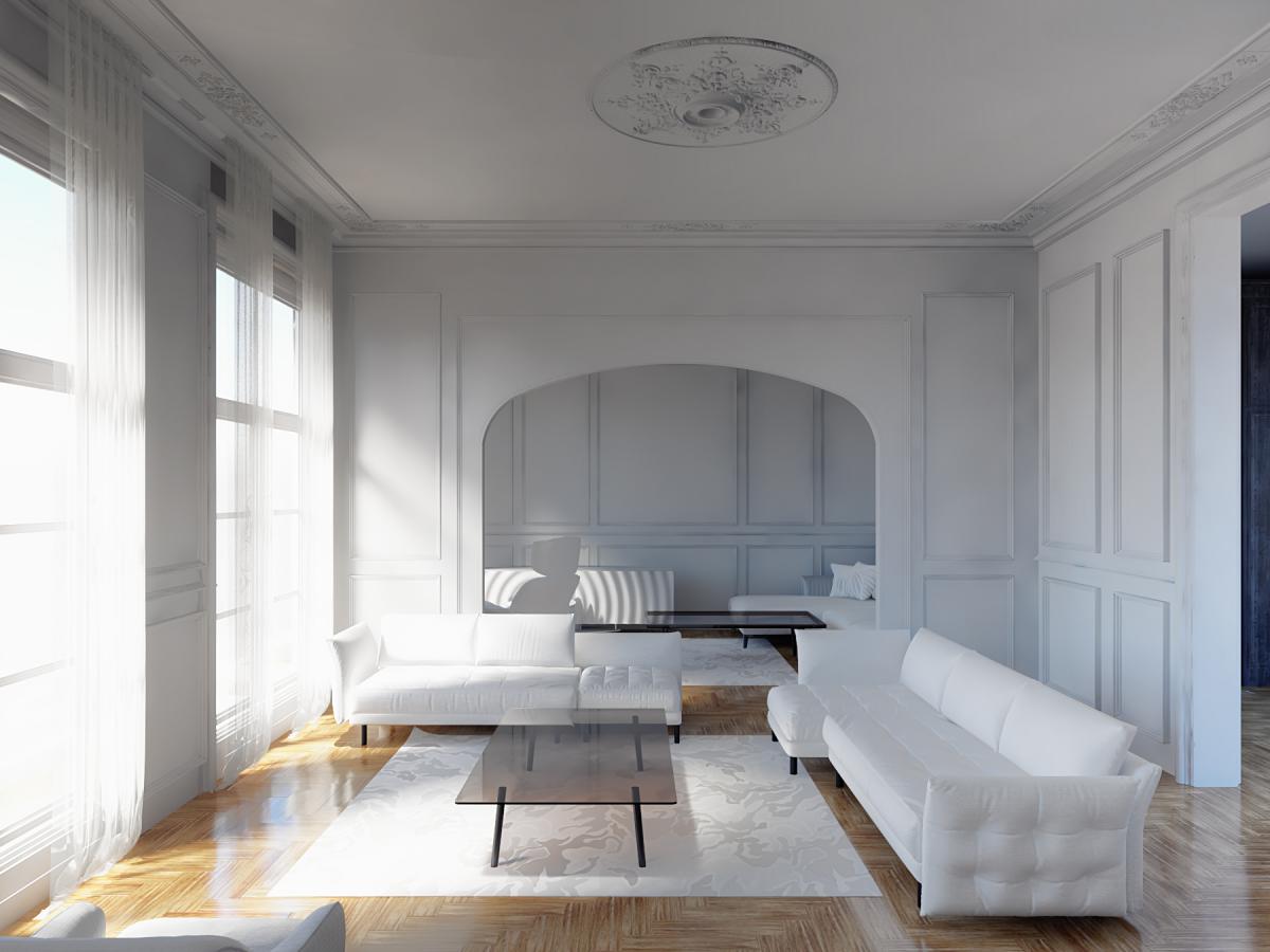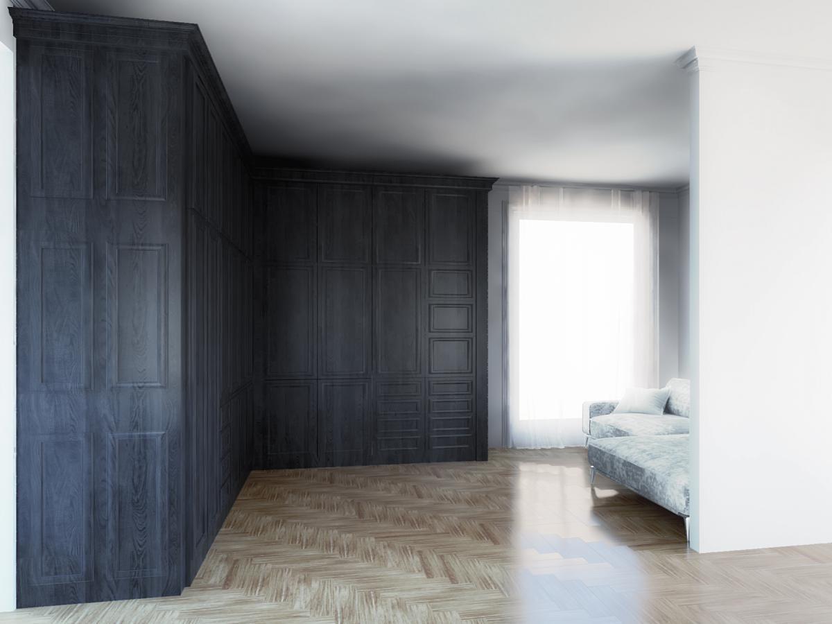 Situated in the luxurious 16em arrondissement avenue Victor Hugo, the once three bedroom, three bathrooms apartment built in the VIVth century, was entirely reconfigured into three master bedrooms with... an additional guest bathroom. Moreover, and after a full re installation of the plumbing and electrical systems, the living room and kitchen were merged into an open living room area with a concealed kitchen in charcoal grey wood cladding, contrasting the entire white space. All these changes took place while preserving the authentic French identity evident in small details such as French panels, gold renaissance accessories (door handles, electric switches), built in chimneys etc. >