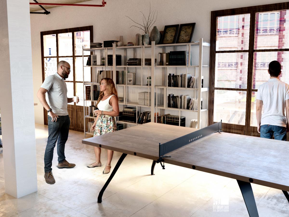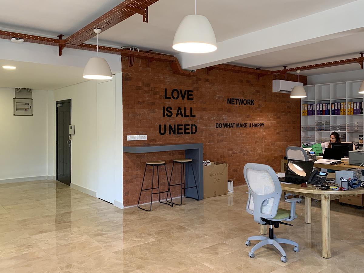 Lying in the vibrant downtown of Beirut, a young entrepreneur looked for an open space office. Breaking tradition, and so called open spaces, we turned the office space into a fun collective plot. A r...ed track lighting designates each zone of the office: communal work table, small circular table for smaller meetings, private desk, tennis table and meeting room. The brick wall holds a positive message above the concrete bar animating the atmosphere and lightening a casual stressful work day. >