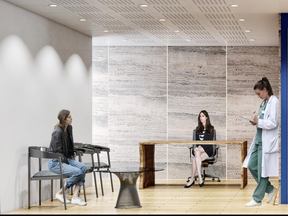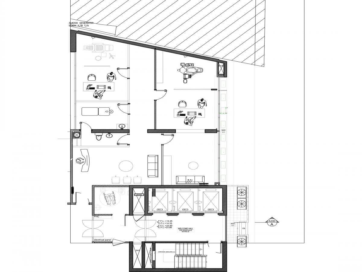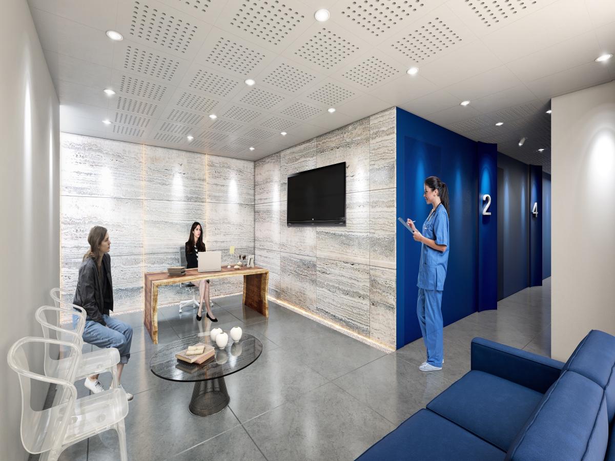 Polyclinic holding a dentist and plastic surgeon in a modern skyrise building. Breaking traditional medical aesthetics while keeping hygiene as a main factor, the cleanest materials and colors used are... marble and royal blue walls. A showpiece lighting fixture in the waiting area shifts the patient’s medical visit into an exciting one. >